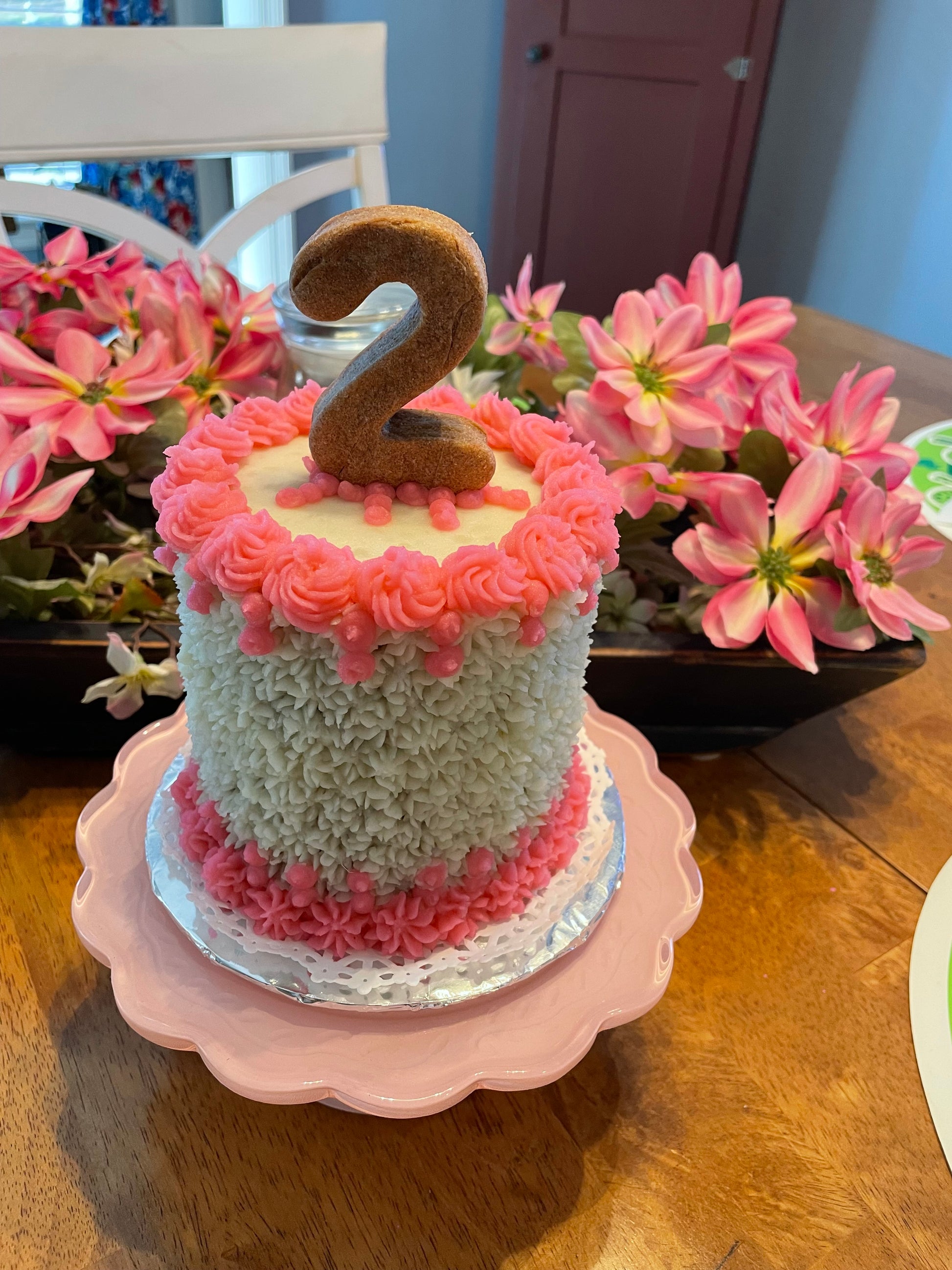 Celebrate "Got ya Day" or any special Birthday with our 4" cake! This size is good for a single pup or cut to serve up to 4 furry friends. Cake price includes decorated cake with your pups name on the side (up to 6 letters please)and topped with their age both in our signature peanut butter cookie!