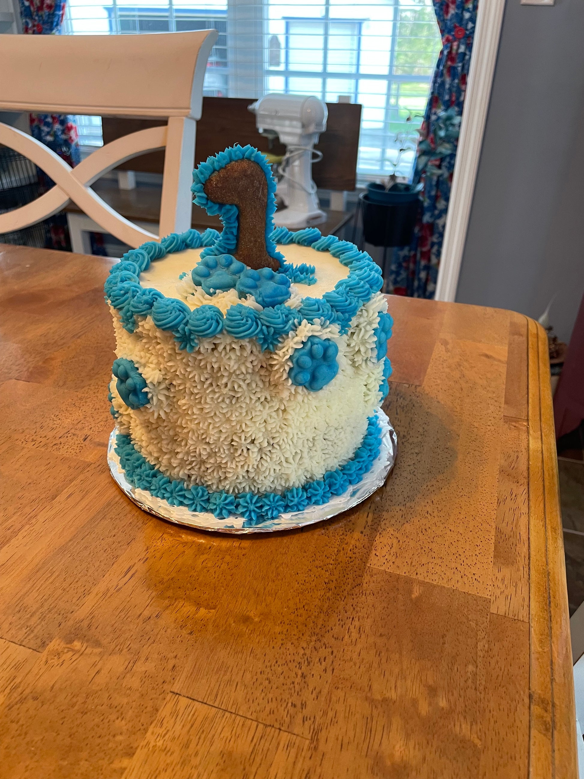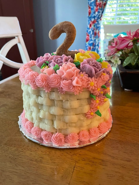 Celebrate "Got ya Day" or any special Birthday with our 6" cake! This size is good for a single pup or cut to serve up to 4 furry friends. Cake price includes decorated cake with your pups name on the side (up to 6 letters please)and topped with their age both in our signature peanut butter cookie!