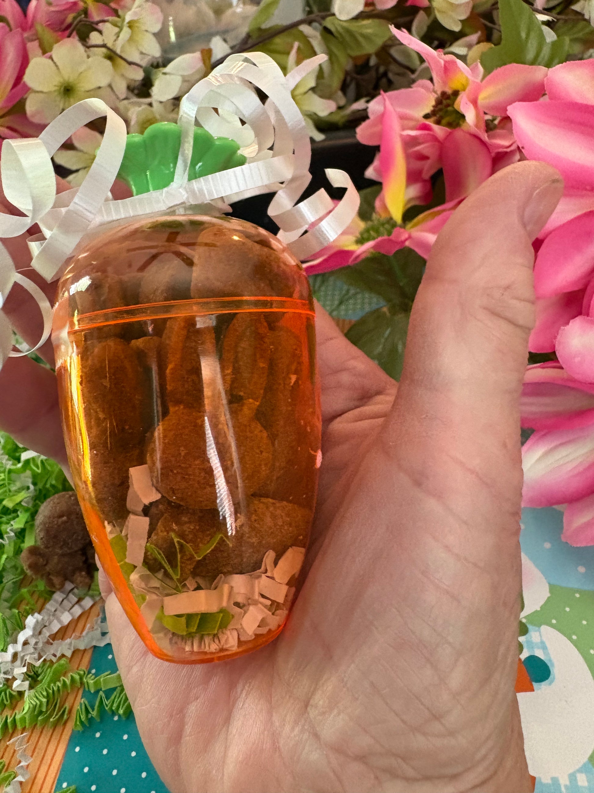 These donuts treats aren’t just bunny-sweet, they’re healthy too! Packed with natural ingredients, you can treat your dog without any guilt. Whether it’s a applesauce, peach, carrot or banana, these tasty bites will make your dog’s tail go round and round like a bunny in a field. 9 shapes treats fill this plastic carrot.