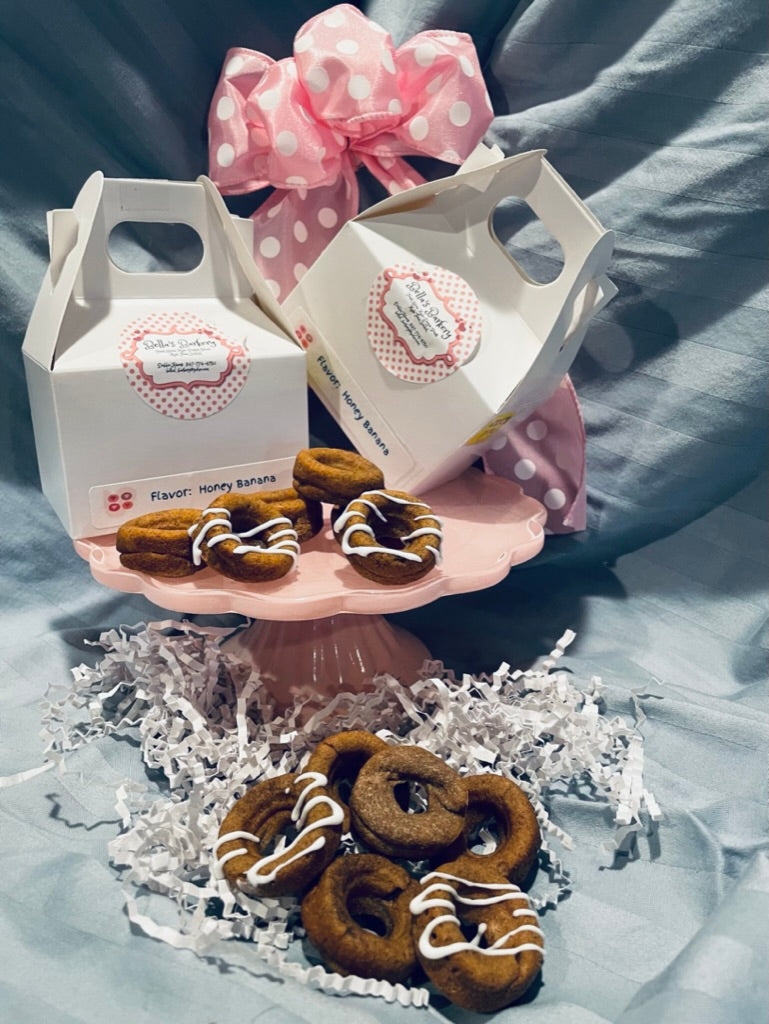 These donuts are about 1.5" in size so they do make a perfect training treat! They are Bella's favorite! We make these in several flavors too, then pack them up in a cute donut box to pop in your bag. You'll find each box comes with cute 10 donuts,