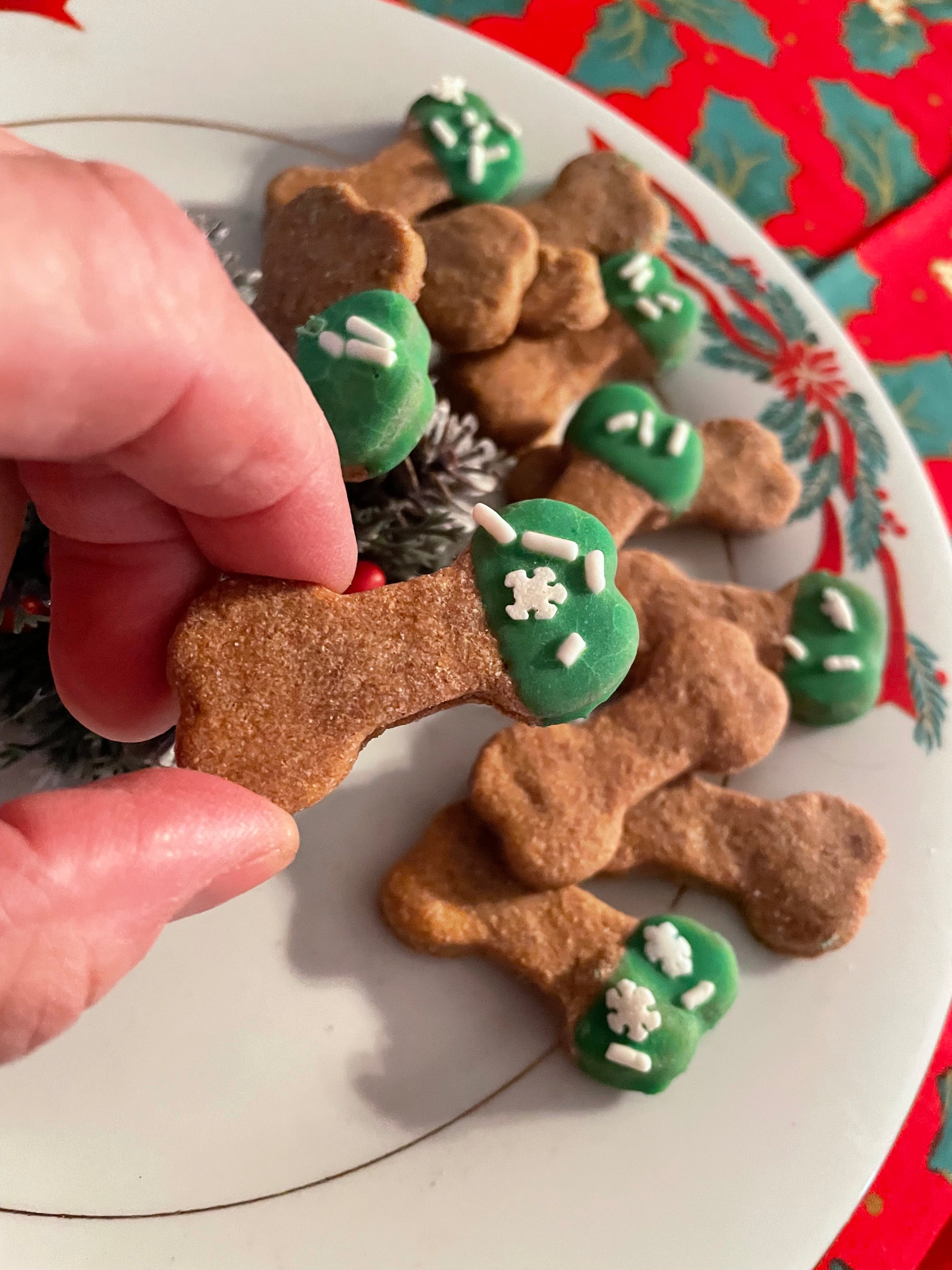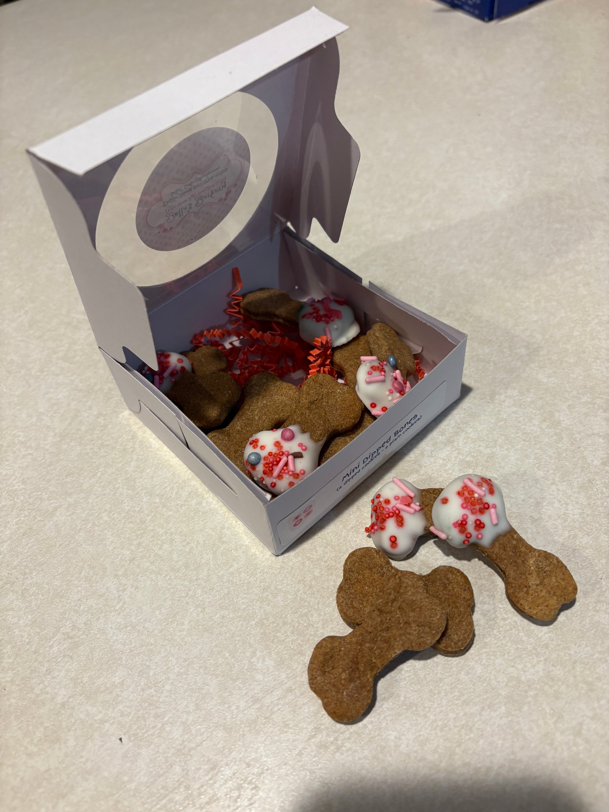 This box is packed with lots of fun n yummy goodness. 12 to 15 Medium sized bones packed with peanut butter n applesauce, then we dipped each in yogurt frosting n doggy sprinkles! Yum- eeeee! Then packed for your puppy’s stockings